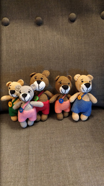 Najpierw był pomysł, żeby kogoś ucieszyć. Pierwszy z misiów pojawił się na podniebnym gdyńskim spotkaniu. Był dość dorodny i dostał czerwone spodenki. Potem kolejne zaczynały dotrzymywać towarzystwa pierwszemu. Jeden, drugi, trzeci, czwarty..... Pierwszy nie czuł się już samotny. Na koniec było ich dwadzieścia pięć. Powędrowały do moich uczniów, żeby stać się dla nich talizmanami do klasy czwartej :) Robione z jednego wzoru od Agi Misie, każdy jednak trochę różny i każdy wyjątkowy, a w każdym zamknięty kawałek mojego serca. Mam nadzieję, że przyniosły radość :)